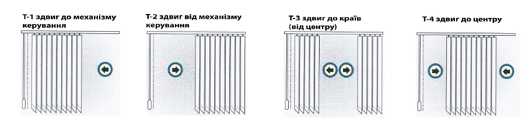 Керування вертикальними жалюзі здійснюється за допомогою ланцюжка (відповідає за проворот ламелів на 180* по своій осі) та шнура (забезпечує рух ламелів по карнизу). Існує декілька типів напрямку руху ламелів: рух до шнура керування або від нього, рух від центру у сторони або ж, навпаки, від сторон у центр: